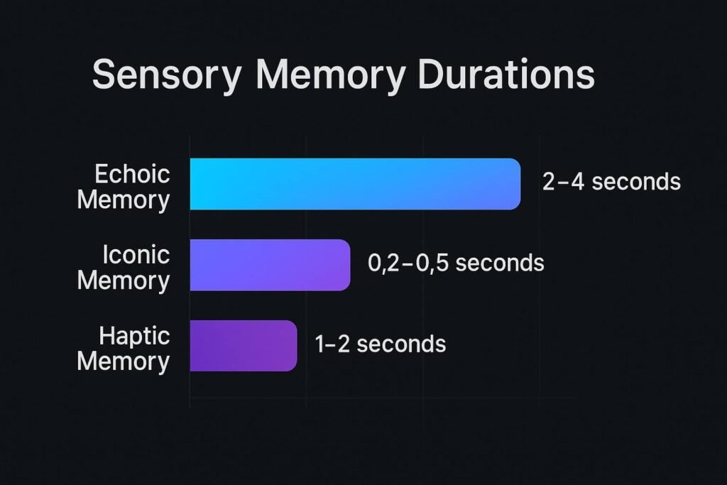 “Bar chart comparing sensory memory durations: echoic memory lasting 2–4 seconds, iconic memory 0.2–0.5 seconds, and haptic memory 1–2 seconds.”