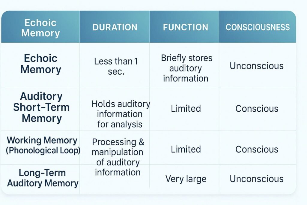 Although most people never think about it, echoic memory is the foundation of spoken communication, learning, music perception, and auditory attention. Without it, everyday life would feel fragmented and confusing—like hearing sounds in pieces that never fully connect.